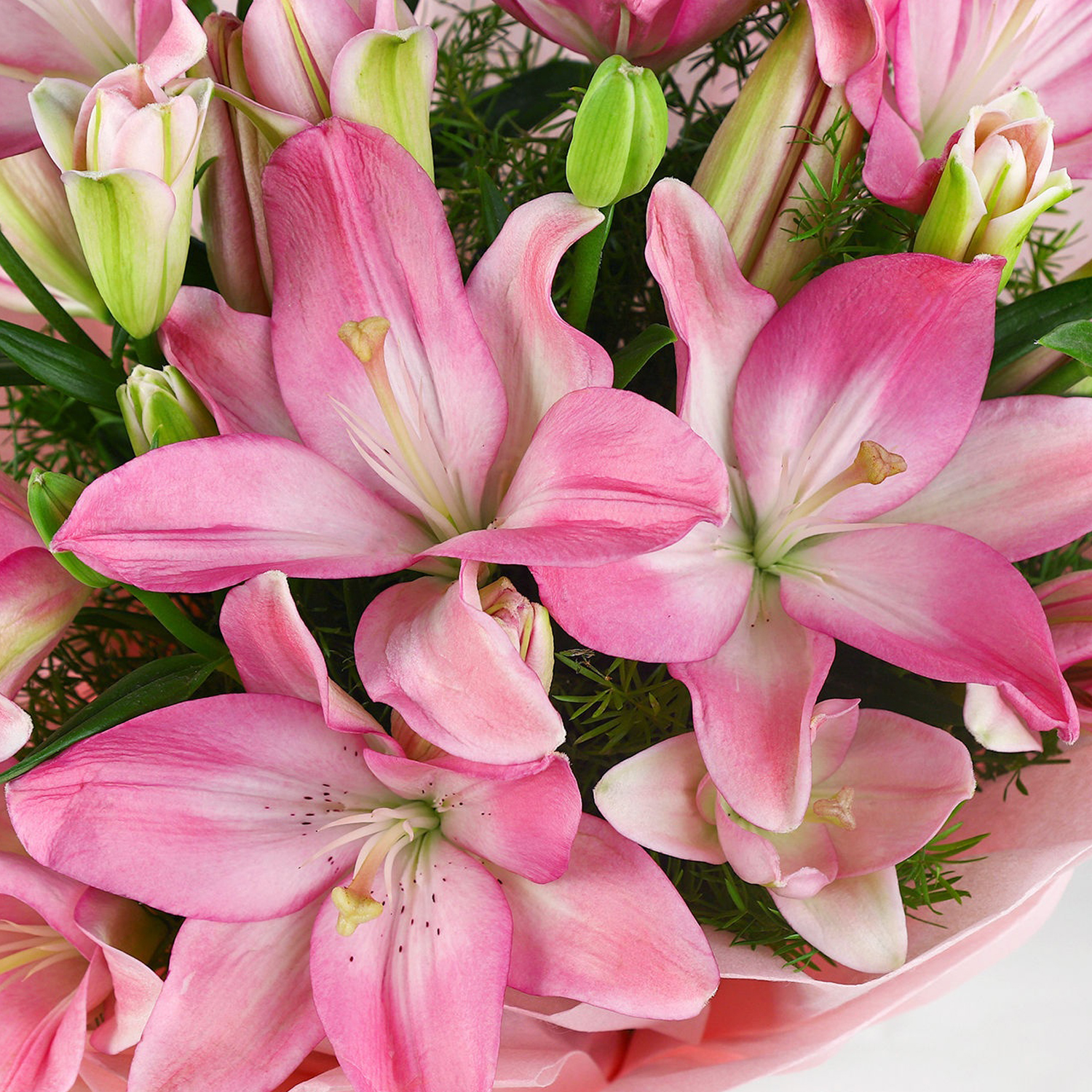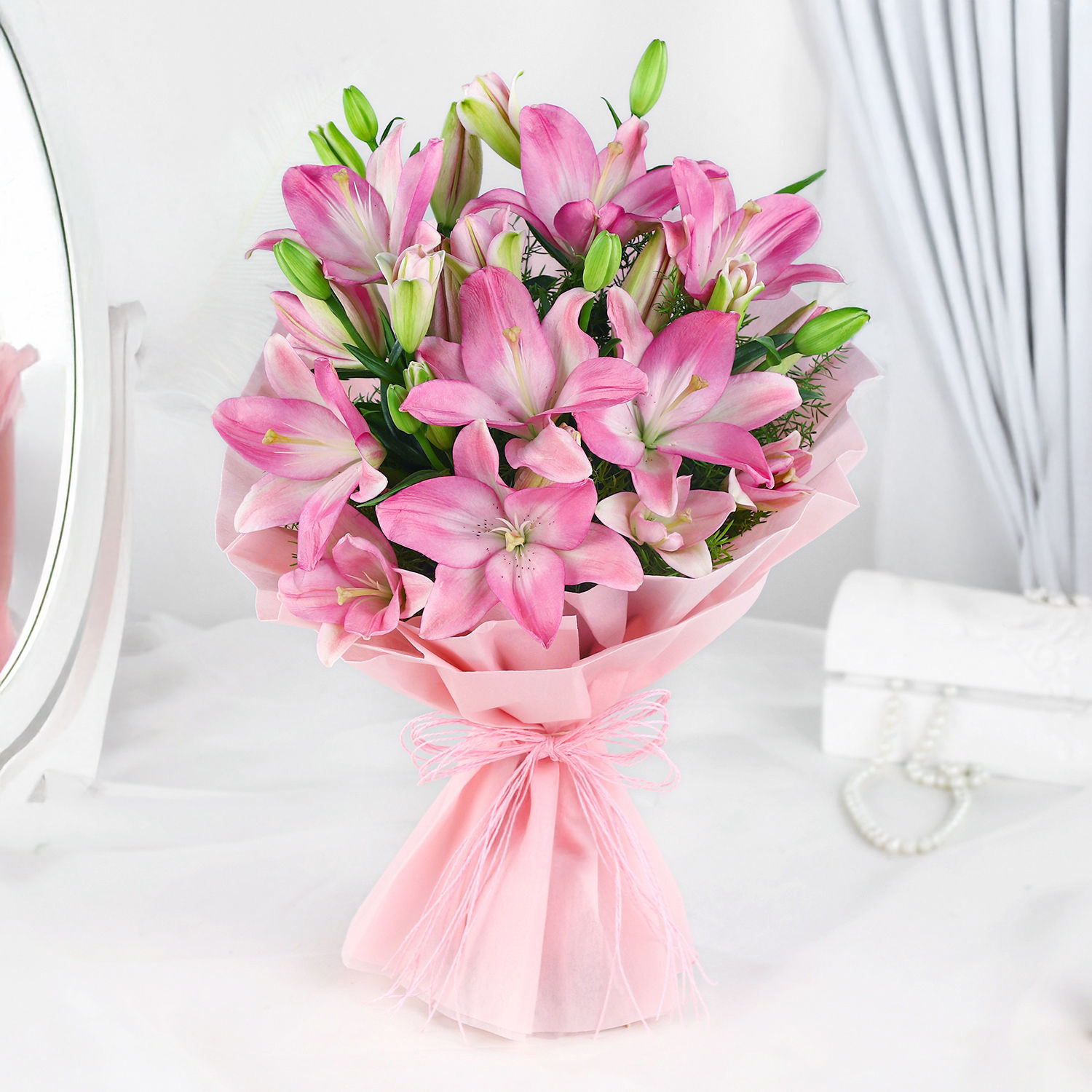 Featuring seven premium pink Asiatic lilies complemented by fresh green fillers, this bouquet radiates beauty, purity and warmth.